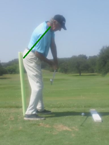 and to the right of your target, then you may be "standing up" in the downswing. In other words, you have not maintained the posture needed to compress the golf ball. In the picture below, the body is too upright and the club is trailing too far behind the body. The hips have been thrust toward the golf ball instead of rotating as they should. From this position it will be difficult to square the club face by impact and my club is destined to hit the 2x4 on the ground I have used for alignment...OUCH!